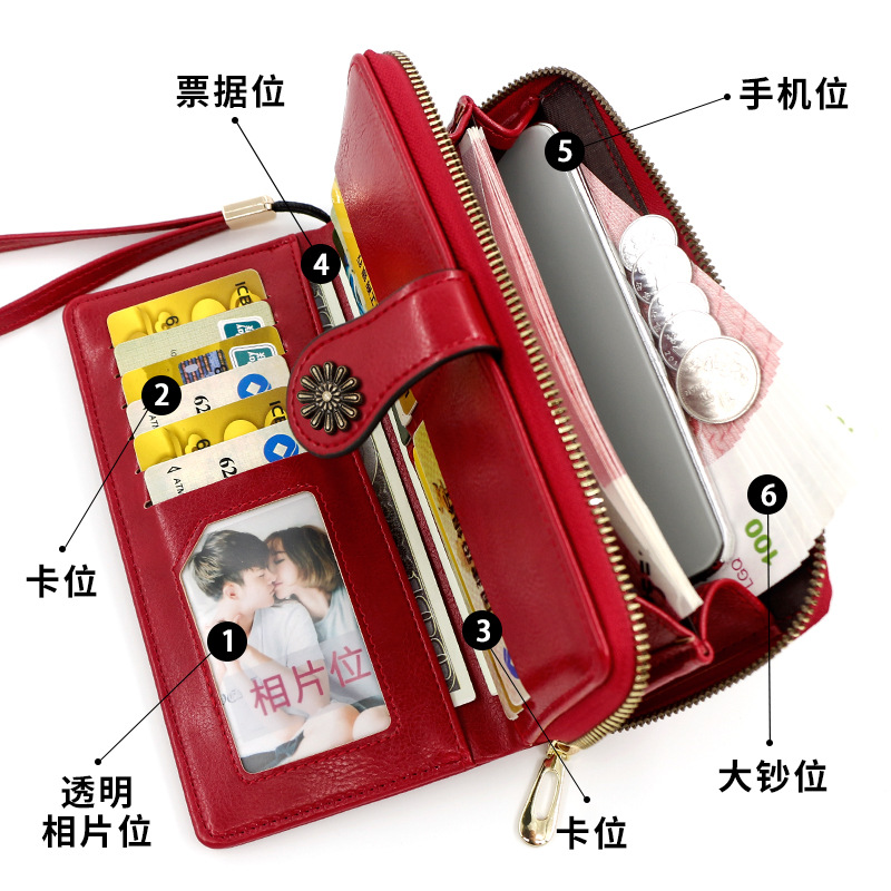 • Ladies long zipper bag European and American waxed leather hollow pattern coin purse card holder